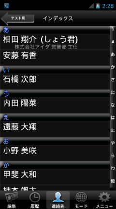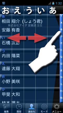 インデックスバーをタッチすることで、目的の名前にジャンプできます。
