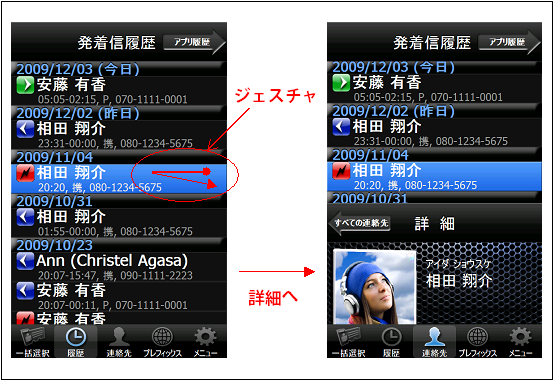 「発着信履歴」「アプリ履歴」の項目から図示したジェスチャ(← →)により、詳細画面がダイレクトに表示できます。